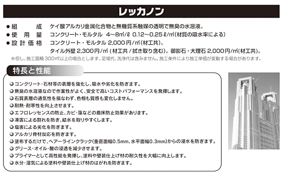 〇コンクリート、石材等の表層を強化し、吸水や劣化を防ぎます 〇作業性が良く、安全かつ高コストパフォーマンスを発揮